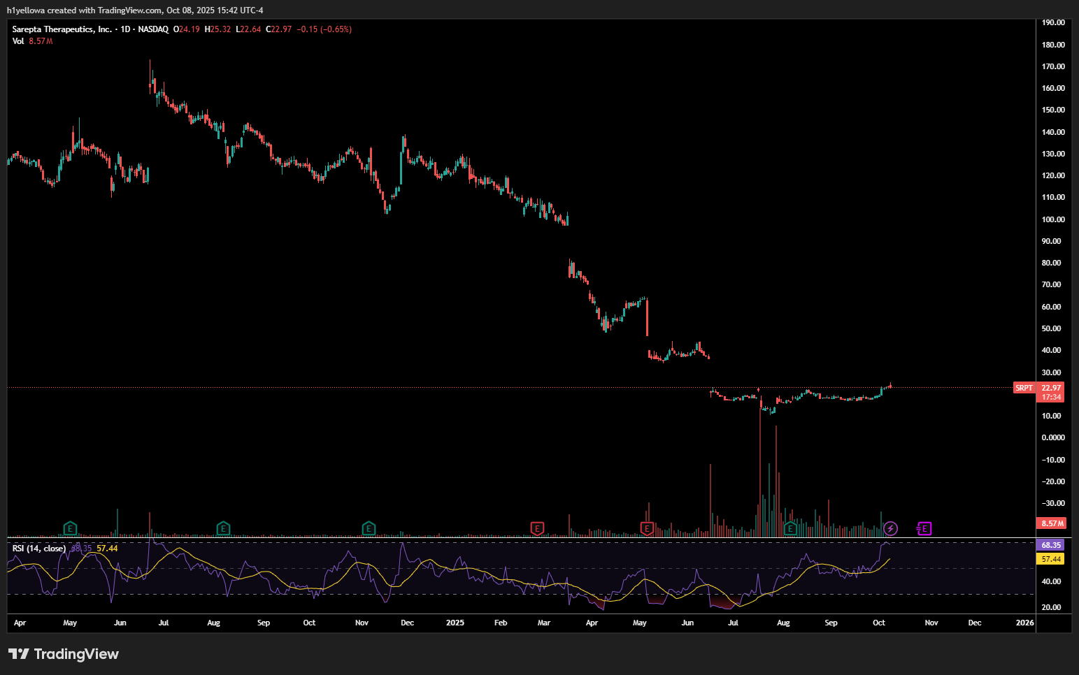 This week, we turn our attention to Sarepta Therapeutics, Inc. (SRPT), a small-cap biotech firm listed on the Nasdaq that specializes in developing gene therapies and RNA-based treatments for Duchenne Muscular Dystrophy (DMD) and other rare neuromuscular diseases. Sarepta is a prime example of a trending, high-risk, high-reward biotech stock, with its performance largely tied to the regulatory and commercial success of its flagship drug, Elevidys.